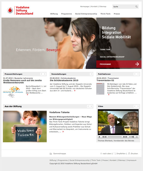 Die Vodafone Stiftung ist eine der großen unternehmensverbundenen Stiftungen in Deutschland. Ponton erstellte ein modernes „Facelifting“ der Website, die nun im neuen Glanz erstrahlt. Optimiert wurden die Struktur des Auftritts und die Usability der Site.