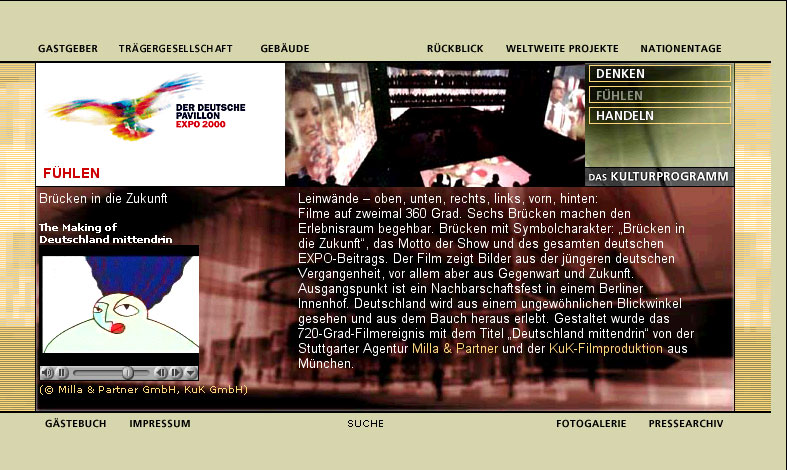 Der über die EXPO 2000 hinaus verlängerte Webauftritt des Deutschen Pavillons unter www.deutscher-pavillon.de fand am 31.03.2001 sein Ende. Bis dahin konnte man noch online das Gästebuch oder den Chat nutzen oder im Archiv stöbern. Doch ganz zu Ende war dieses Projekt danach dennoch nicht: Die Ponton-Lab GmbH wurde vom Presse- und Informationsamt der Bundesregierung beauftragt, das Projekt Deutscher Pavillon auf CD-ROM zu dokumentieren.